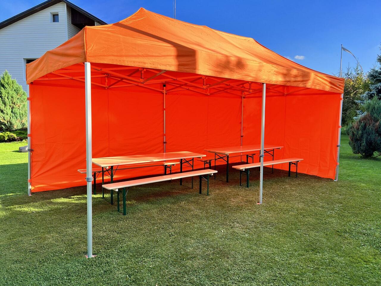 Komplekti kuulub raam, katus, 4 seina, ratastel kandekott, vaiade komplekt ja vajadusel raskuskotid